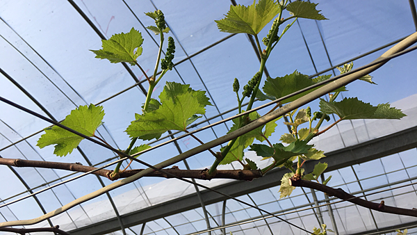 單以葉片有無黃化來判斷養分是否有回流,其實並不是那麼準確,還要配合觀察是否有新葉生長或掛著果實這種消耗養分的情況出現,才能判斷回流的情況。在楊小姐的溫室裡,並沒有新生葉片來幫忙消耗養分,所以,綠意盎然、生機蓬勃的葉片就意味著「光合產物工廠」產能全開,持續進行製造大量的光合產物,並全數送往葡萄枝條與根系裡儲存備用,所以才能讓每根枝條成熟後都是又大又粗壯!